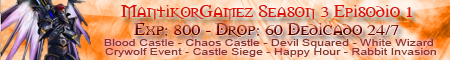 MantikorGamez [1.04J] Season 3 Episodio 1 | Exp: 800x | Drop: 60% | Dedicated Server 24/7 NO LAG [100Mbits] | Castle Siege | Crywolf Events | Blood Castle | Chaos Castle | Devil Squared | White Wizard | Rabbit Invasion | Happy Hour | GM's Events |
