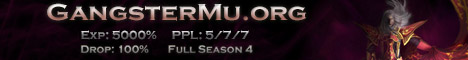 Gangster Mu Season 4 FUN [exp:9999%][Drop:100%][PPL:10/15/15][Unique PVP Arena][Whole game process can be achieved][socket system 100%][Kundun BOSS Respawn 30 Second][Jewels in Shop][Chaos Machine 90%][MaxStat:65535][Join Now]