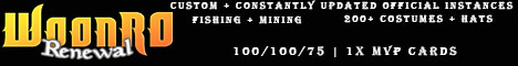 100/100/75 | 1x MvP Cards - Up to date official instances - Custom instances - Fully implemented Rebellion - Fishing - Mining - 300+ Costumes & Hats - Mission System - Friendly Community - And much more -